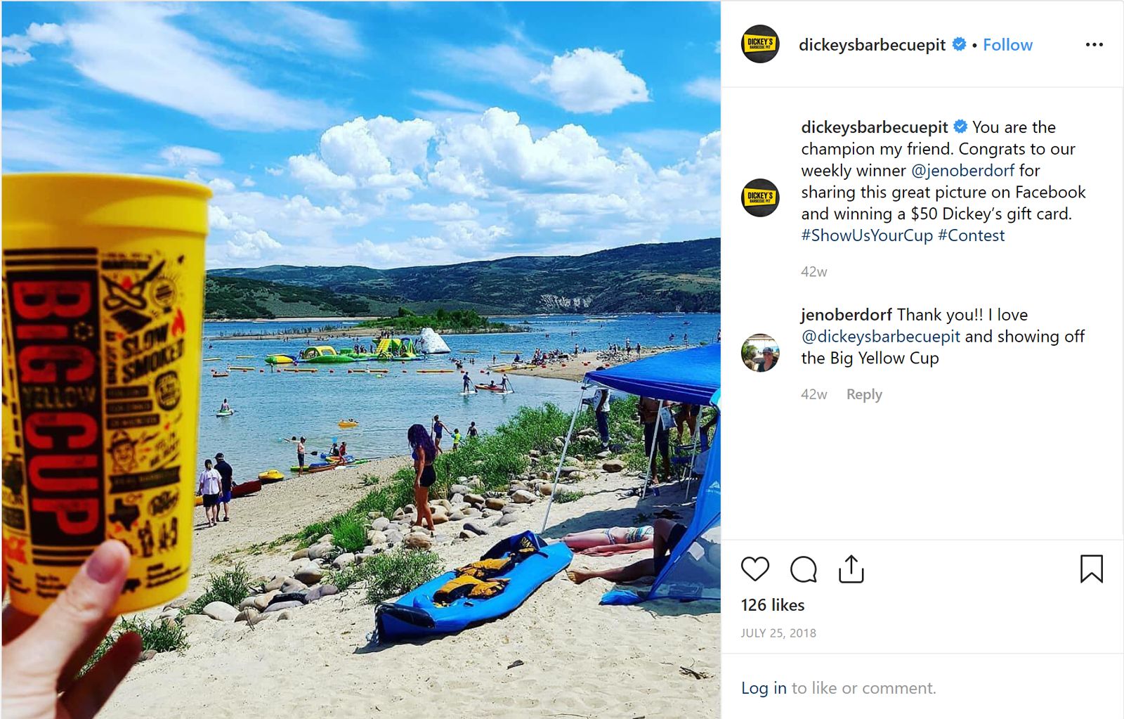 From Memorial Day through Labor Day, Dickey’s will host a contest through Instagram, Facebook and Twitter, where barbecue lovers can enter to win numerous prizes, including Free Barbecue for a Year, Pitmaster Packs, Dickey’s Gift Cards and one grand prize winner will receive an all-inclusive vacation for two to Cancun, Mexico. To enter the contest, guests will have to follow Dickey’s Barbecue Pit on one of three social media platforms (Instagram, Facebook and/or Twitter), post a photo of where they’ve taken their Big Yellow Cup on their summer adventure, and use the hashtag “ShowUsYourCup”, “Contest.” Complete rules will be available on the Dickey’s website prior to the start of the contest.